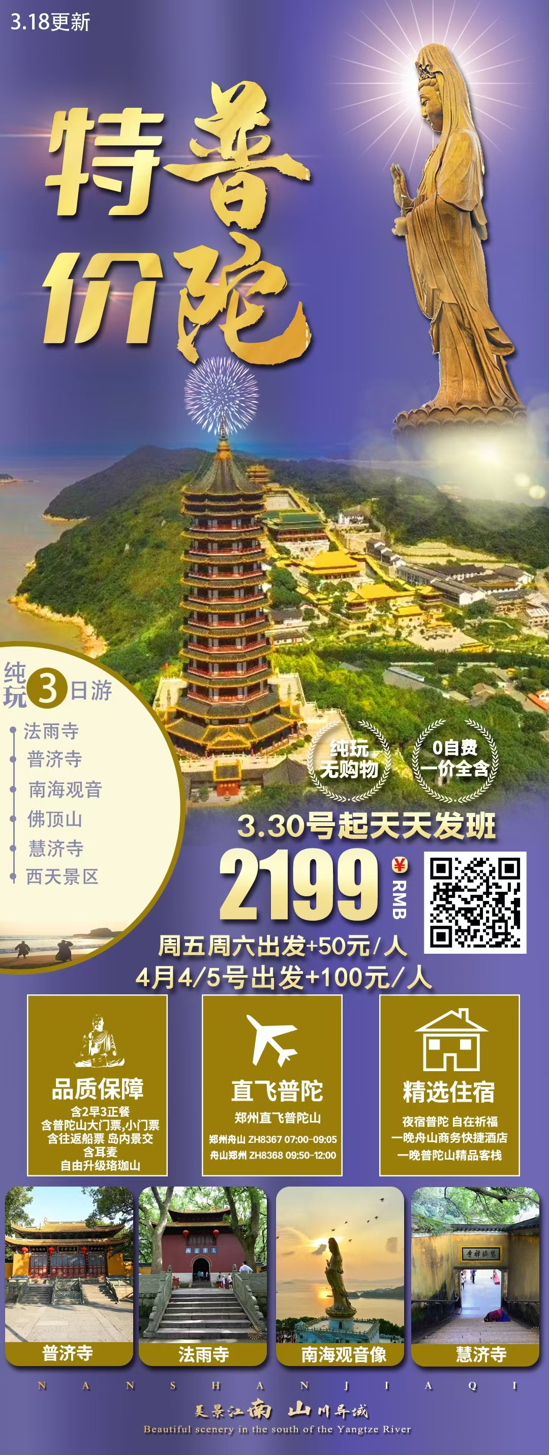 普陀山,國家5A級旅游景區,中國佛教四大名山之一,位于舟山群島東南部海域,有悠久的佛教文化,古人稱之為"海天佛國"、"南海圣境"、"人間第...